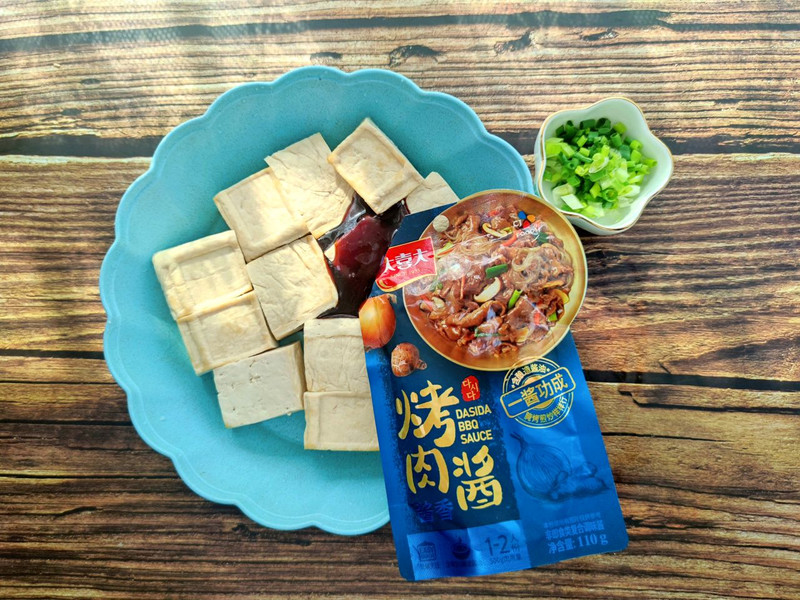 豆腐切小块,大喜大酱香烤肉酱涂抹在豆腐表面腌制三小时。