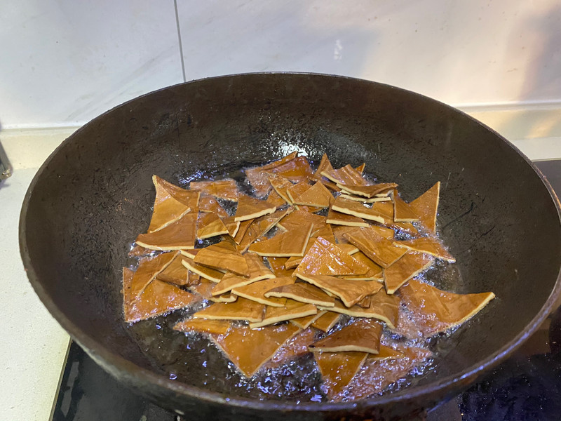 豆干先炸后卤,可以使豆干口感有嚼劲,且充分入味。