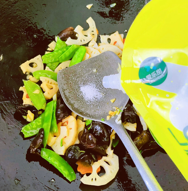 莲藕微甜而脆,可生食也可炒菜、煲汤都非常好吃而且药用价值相当高。莲藕搭配木耳、荷兰豆、胡萝卜最后用爱乐甜零卡糖增加了菜的品味减糖不减甜无负担。好味道营养更丰富