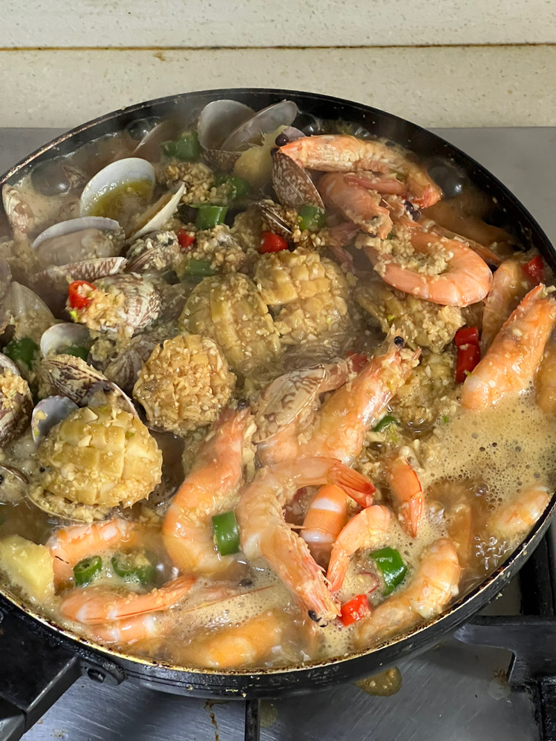 海鲜可以根据自己的喜好加,每样一点就很多了,加水煮的时候水一定不能多,煮煮水会多的,锅小的话煮开后打开锅盖继续煮,直到海鲜煮熟!