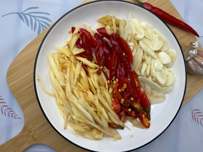 我这里没有放盐,因为酸辣椒和酸生姜有盐,大家可以最后尝味道觉得淡了可以放点盐