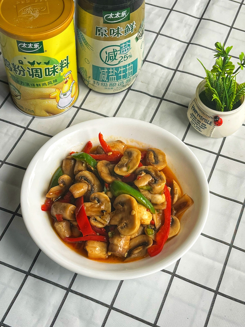 口蘑切片炒更容易入味,熟的也快。炒几分钟就可以出锅了。