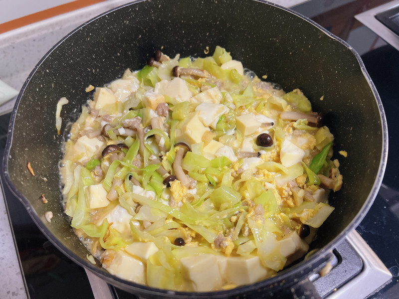 原想着做个肉末抱蛋,配上点儿米饭吃,但是不吃菜心里不舒服,索性把冰箱里的剩菜切吧切吧放进去,做成了一锅菜肉豆腐抱蛋,鲜香诱人,营养齐全啊!