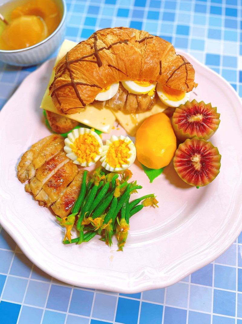今日早餐分享:鸡肉三明治、凉拌黄瓜花、奇异果、芒果、黄桃罐头