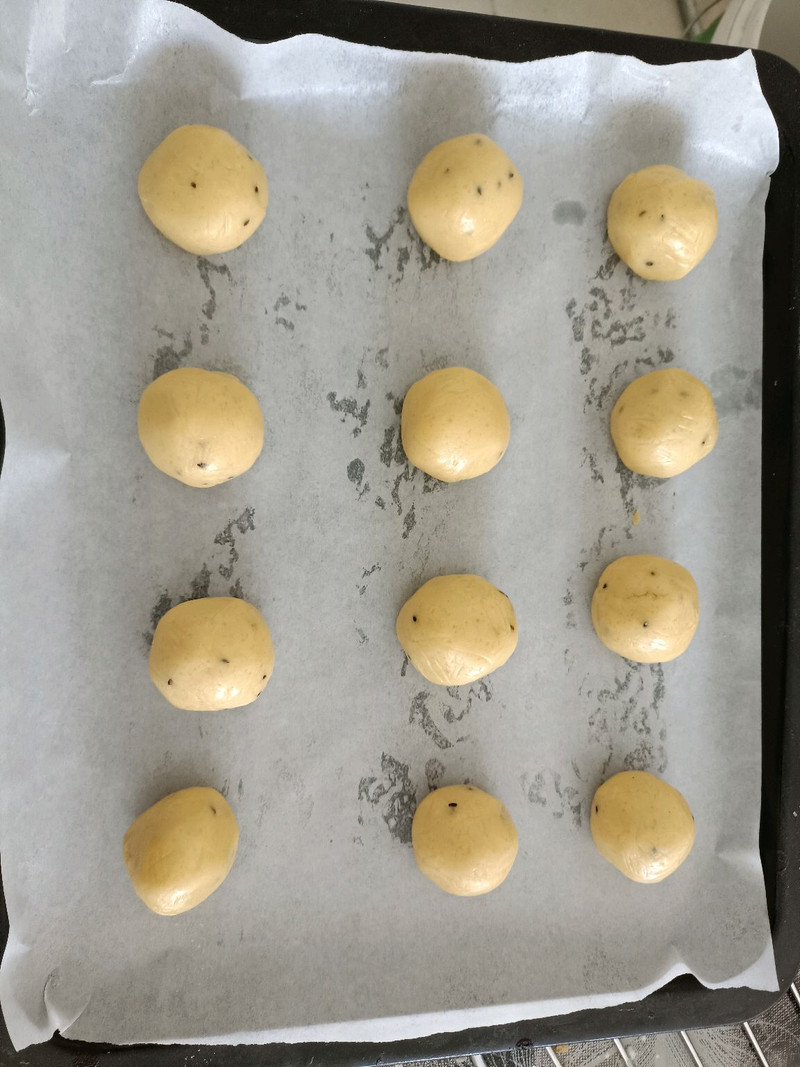 猪油100克玉米油25克,加一个鸡蛋,90克糖搅匀,再加入240克低筋面粉,2克盐,3克泡打粉,2克小苏打,揉成面团,分成十二份按压一下,烤箱175度25分钟