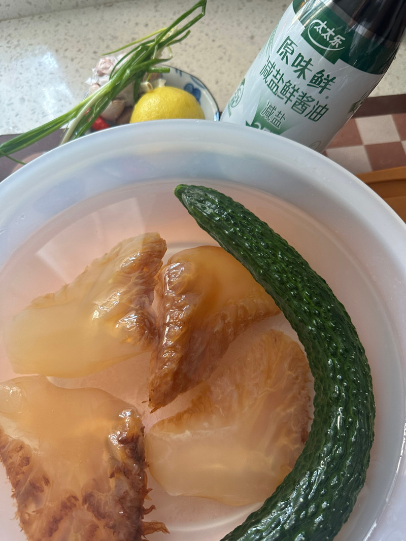 这个海蜇也可焯水 最多一分钟 就出锅 这个海蜇一定要用清水浸泡七八个小时左右才可以 我上次泡了三四个小时拌出来咸不能到掉了 中途还要多换几次清水