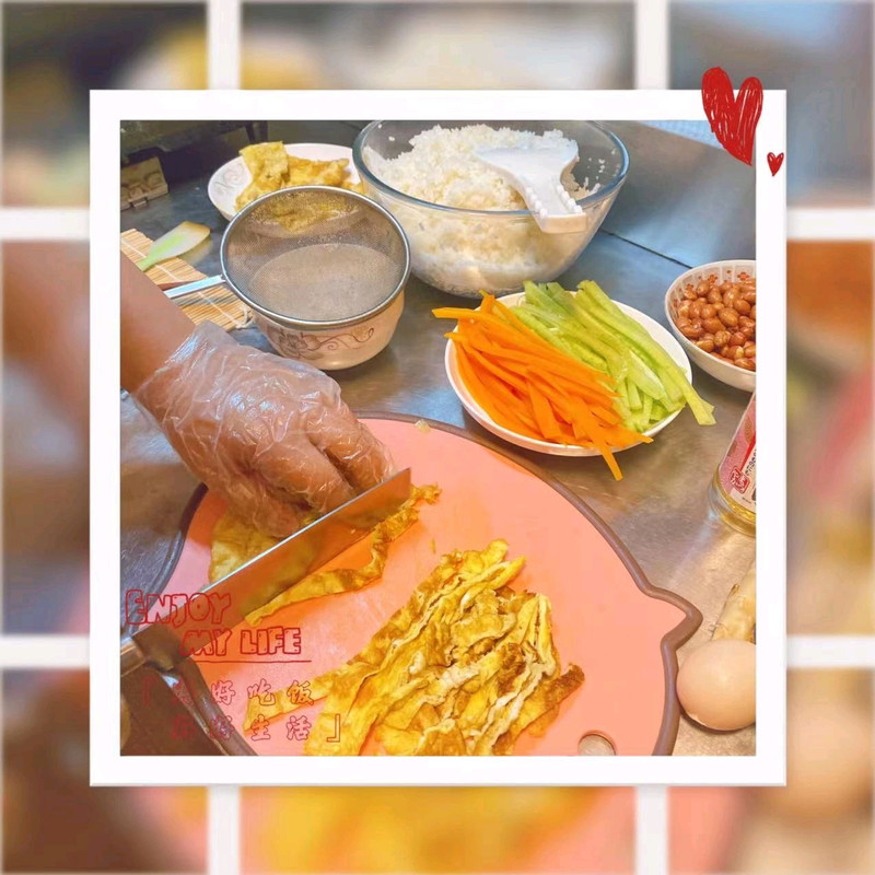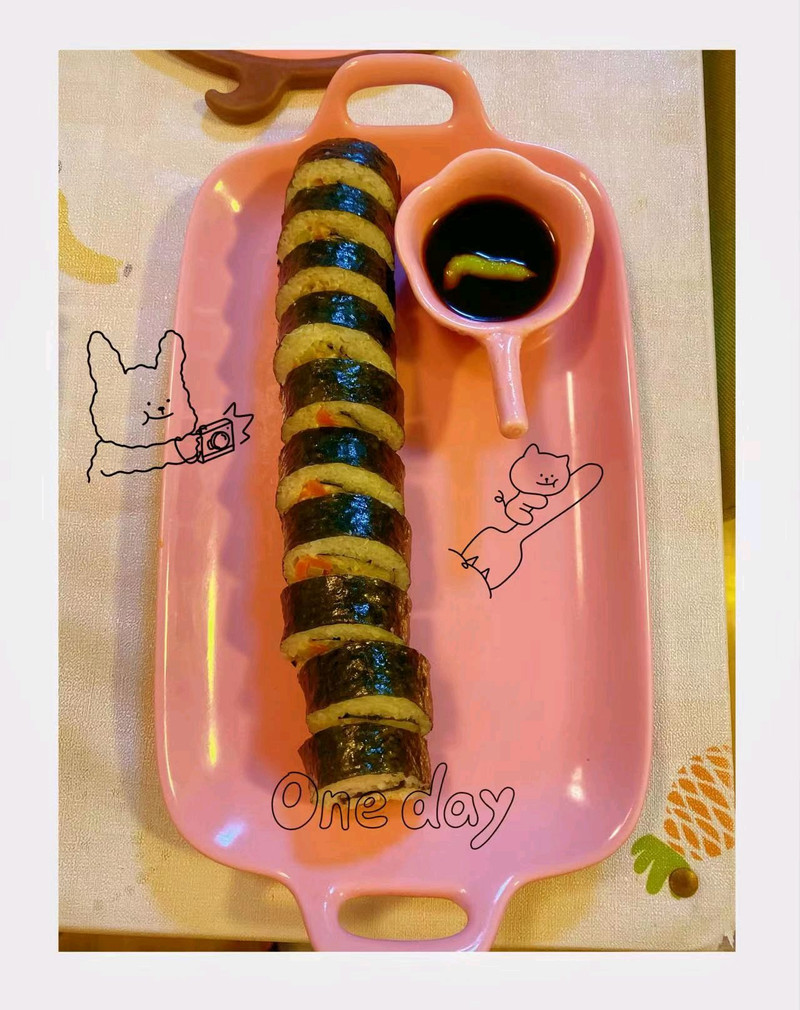 tip:注意做这道菜的时候最好戴上手套,并且在手上可以抹点油,这样做寿司的时候,米饭就不会粘得满手都是了。