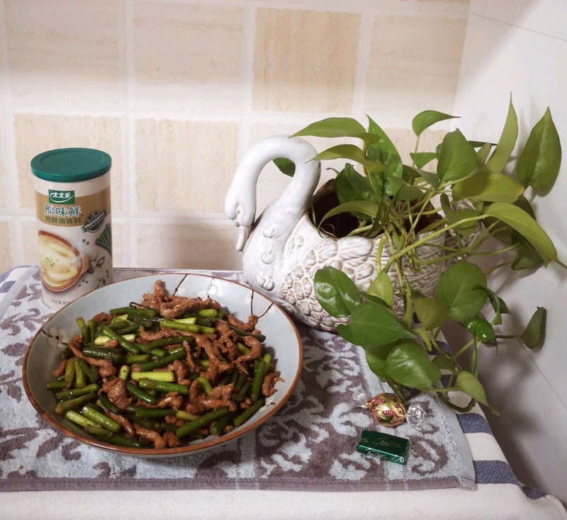 翠绿色的蒜苔膳食纤维丰富及富含微量元素 肉丝炒蒜苔搭配个杂粮米饭 添加了太太乐减盐蚝油香喷喷的肉丝 脆爽的蒜苔增加了嚼劲 让你爱吃的停不下来 非常下饭…