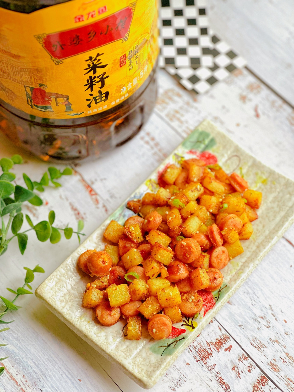 这应该是每个大朋友、小朋友都无法抗拒的小吃了,不管出摊还是家里做,都是抢手舔手指的一道。土豆和肉肠,经过金龙鱼外婆乡菜籽油的煎炸,表皮焦香并有浓浓菜籽香味,撒上香气扑鼻的烧烤料,让口感更佳丰富