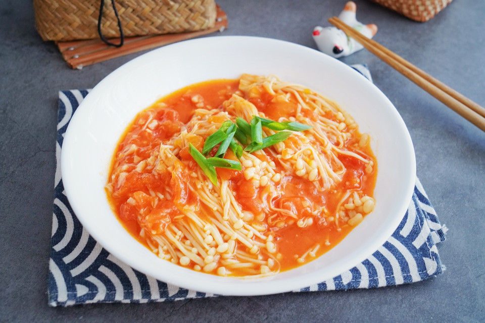金针菇富含碱性蛋白和膳食纤维,具有提高免疫力、促进食欲、促进肠胃蠕动,调脂降压、消除疲劳等功效。西红柿口感酸,可以刺激唾腺的分泌,提高食欲,富含维生素C,具有生津解渴的作用!