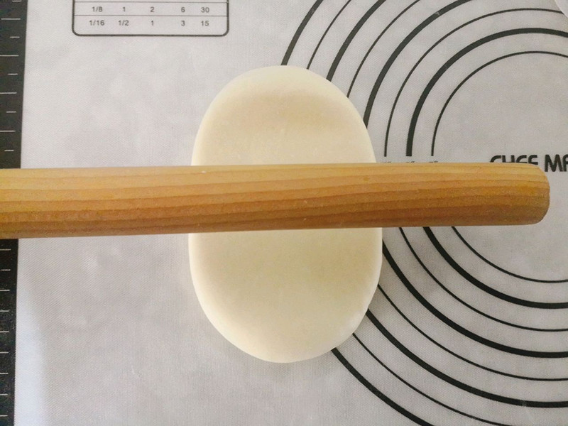 松弛后的面团光滑面朝上,稍微拍扁,用擀面杖从中间往上下擀成椭圆形。
