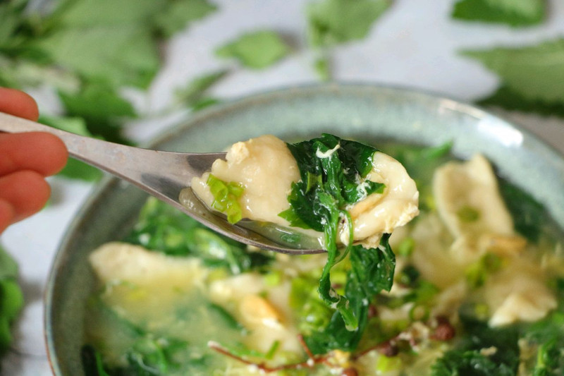 “灰条复灰条,采采何辞老”,其中灰条就是灰灰菜,春夏采摘的鲜嫩灰灰菜头,炒菜汤煮,口感细腻,味道鲜美, 营养丰富,消毒杀菌,实在是一道不得多得的"野味"。小区园子里长了两大棵野灰灰菜,半人高,细细摘了些嫩头,回来就揉面,做个养胃的汤食。