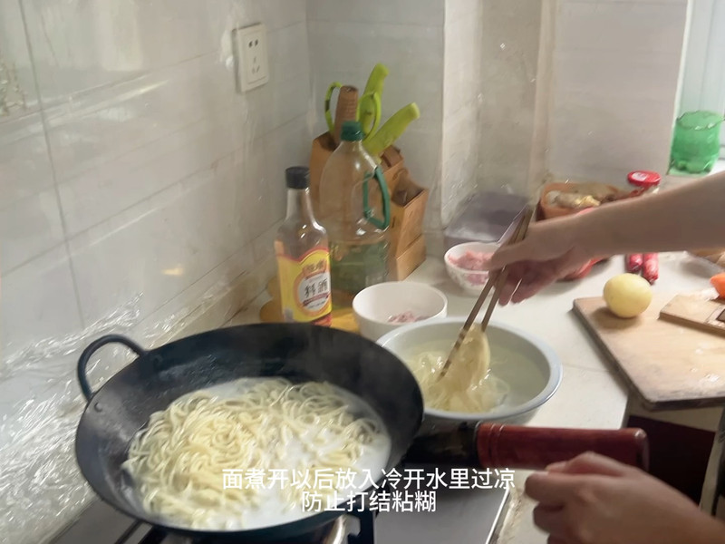 炒面的时候不停翻炒,如果发现面粘锅了,可以略加一点开水,不用炒太久,炒到颜色均匀即可装盆