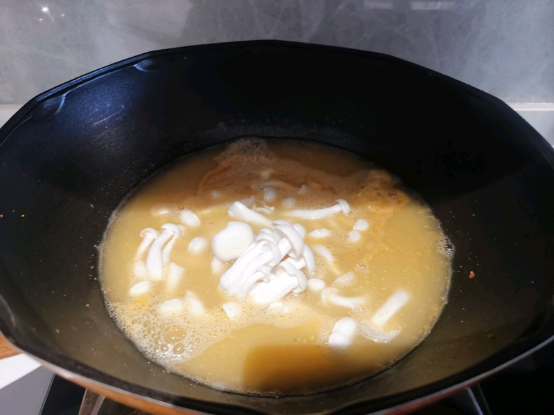 做这个豆腐煲,顺序不太重要,我是用了两口锅,所以更方便一点,如果是一口锅操作的话,就建议先虾头油;然后煸虾仁,捞出;然后炒蛋黄,加清水,加白玉菇,加豆腐,加虾仁这样,非常简单。
