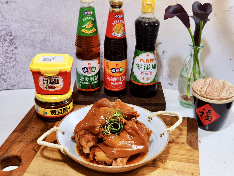 焖猪手,同时加入葱伴侣 6月香甜面酱和葱伴侣 原味黄豆酱,二种酱历经90天酿造,遇热后产生“美拉德”反应,激发酱香味,酱香更浓郁,风味更丰富。