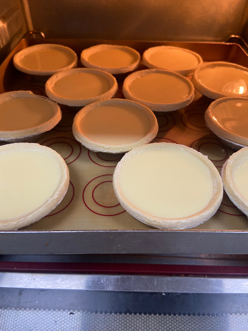 倒完蛋挞液后的蛋挞马上送入烤箱,避免时间太久蛋挞液会把蛋挞皮浸软。