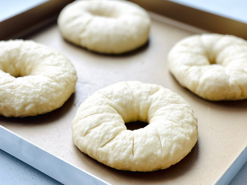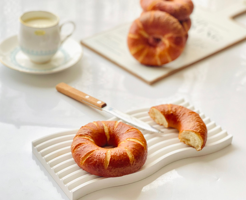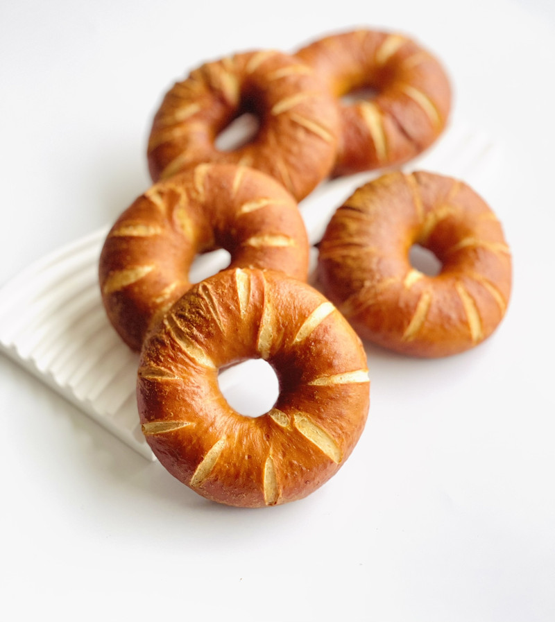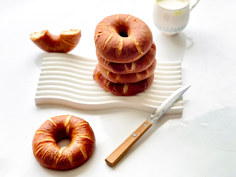 煮贝果的水里加了一些小苏打,白糖换成了红糖,随意的在贝果上割了几刀,朴实而又漂亮的贝果就出炉啦,是我喜欢的颜色,口感扎实有韧劲,在麦香的基础上还带有淡淡的碱面的味道。