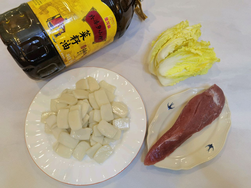 所需食材:猪肉200克、大白菜6片、宁波年糕400克、生姜1小块、食用油25毫升、盐和胡椒粉适量、鸡精少许(还可以添加香菇或冬笋)。