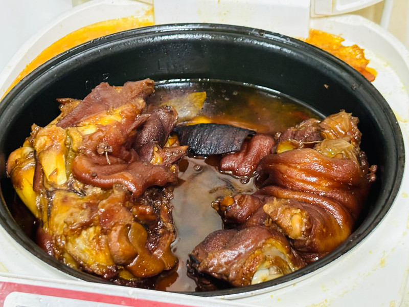 炖煮时注意观察,最下面的猪蹄容易煮烂,需要调整位置;