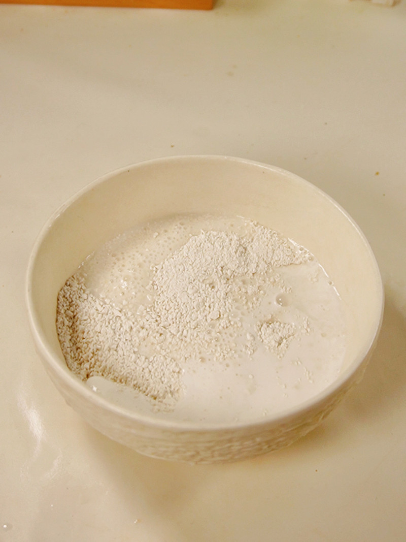 ③ 趁热加入1汤勺(50ml)白色生浆,快速搅拌至浓稠状