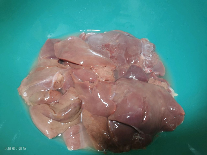1.鸡肝鸡剪去一管和筋膜,清水反复清洗至没有血水渗出,在冷水下锅。