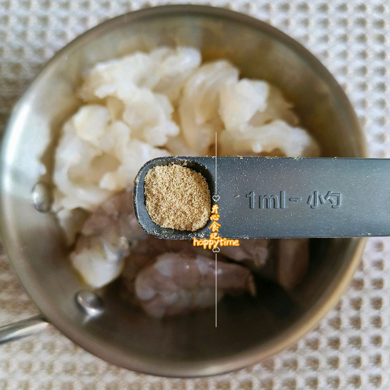 虾仁和鱼片放入碗中,加入1克盐,1克白胡椒粉,2克料酒,2克玉米淀粉拌匀,腌制备用