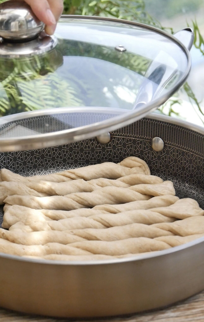 平底锅抹上植物油,放入卷好的卷子,加盖发酵至1.5倍大;