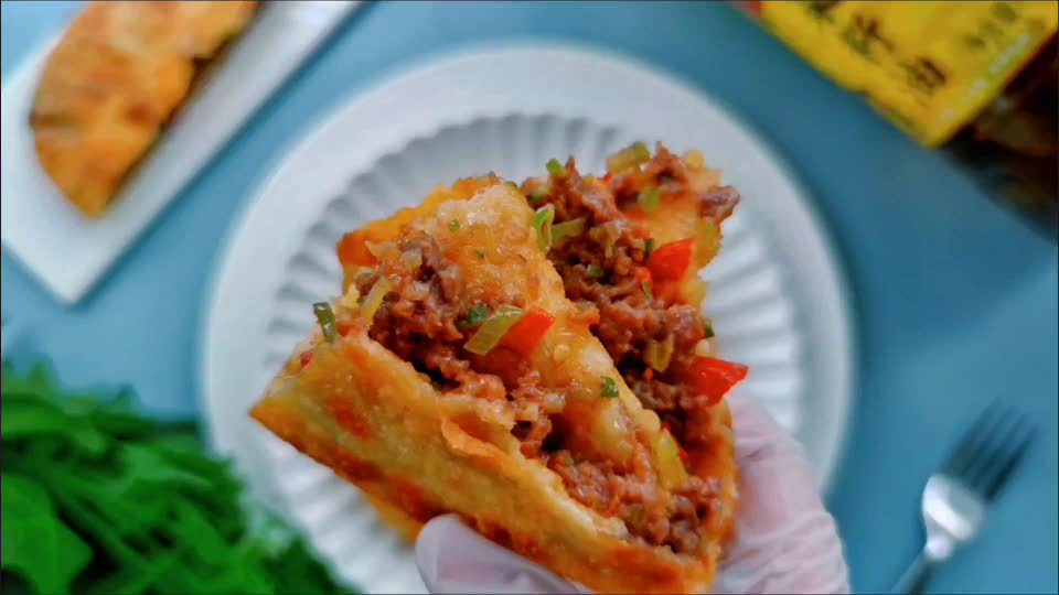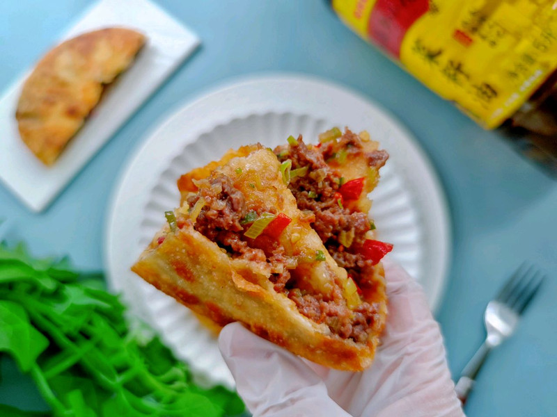 制作方法:1.发面宝撒入面粉里,加入适量温水,搅拌成絮状,揉成面团,醒发。2.牛肉剁成泥状,洋葱切碎放入碗中,倒入减盐酱油、红烧酱油和鸡精,搅拌均匀后,撒上澄粉,放入剁椒搅拌均匀,倒入少许花生油锁住水分。3.面团揉光滑,分成4等分小的面剂子。取一个面团,压瘪,用擀面杖将面团擀薄,铺一层牛肉馅,做成饼状。4.油温60°,放入牛肉饼,煎至两面金黄色即可出锅。