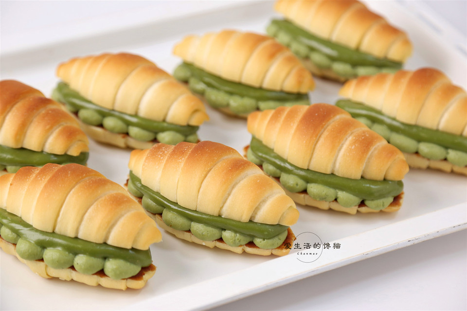 温度28℃发酵至1.5倍大小 烤箱上管205度下管195度预热好,放入烤箱烤19分钟出炉 抹茶卡仕达酱食材混合材料,过筛进锅,小火煮,不断翻拌,锅边冒小泡后熄火,放入黄油拌匀即可 抹茶卡仕达酱食材:蛋黄2个,糖25克,牛奶200克,玉米淀粉12克,黄油10克,抹茶粉3克