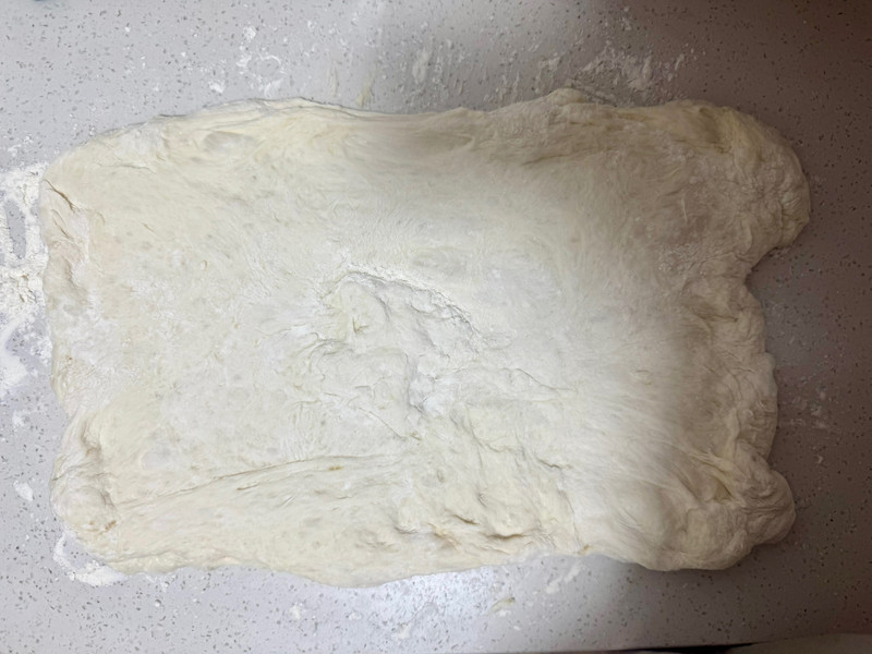 因为喜欢吃土豆香肠焖饭,所以突然想做个面包版的看看如何,这个菜谱是含水量高的恰巴塔面团,不揉不隔夜发酵,不用特殊酵种,下班后操作即可完成,作为第二天的早餐。做好后面包又暄又软,广式腊肠很是提味,后悔没多加一些。