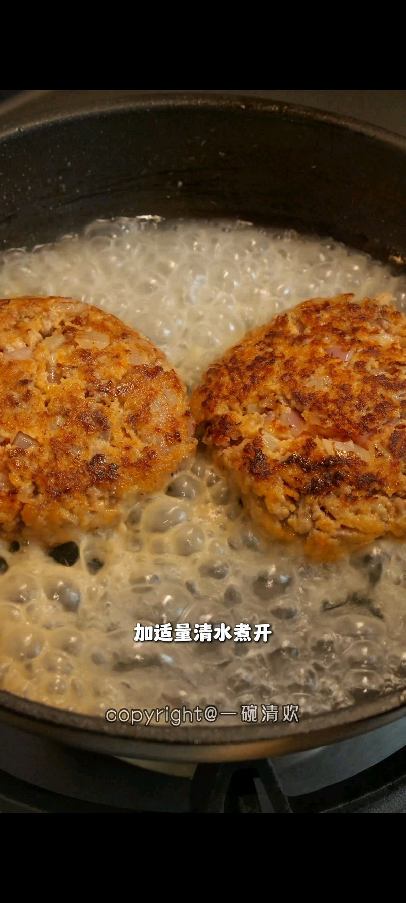 牛肉馅加洋葱碎、盐、黑胡椒、少许生抽和淀粉搅匀,捏成圆饼煎至两面金黄,加少许清水焖3分钟。