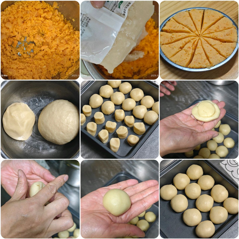1.咸蛋黄10个喷酒放入空气炸锅180度烤10分钟,取出碾碎。 2.加入白芸豆沙300克,拌匀 3.分成12份盖保鲜膜,放入冰箱冷藏备用! 4.配方里的油皮,油酥分别活成团,盖保鲜膜醒面松弛一小时(室温过高放冷藏松弛) 5.油皮,油酥都分成12份 6.取出一份油皮包住油酥 7.封口 8.团圆 9.依次完成所有面团.盖保鲜膜松弛15分钟。