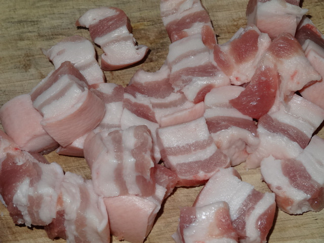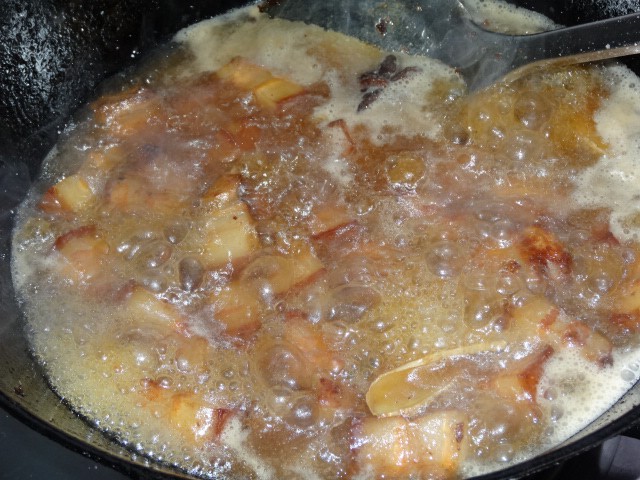 2 肉块下入糖色后,小火微微煸炒出油,肉烧好后,吃着口感不油腻。