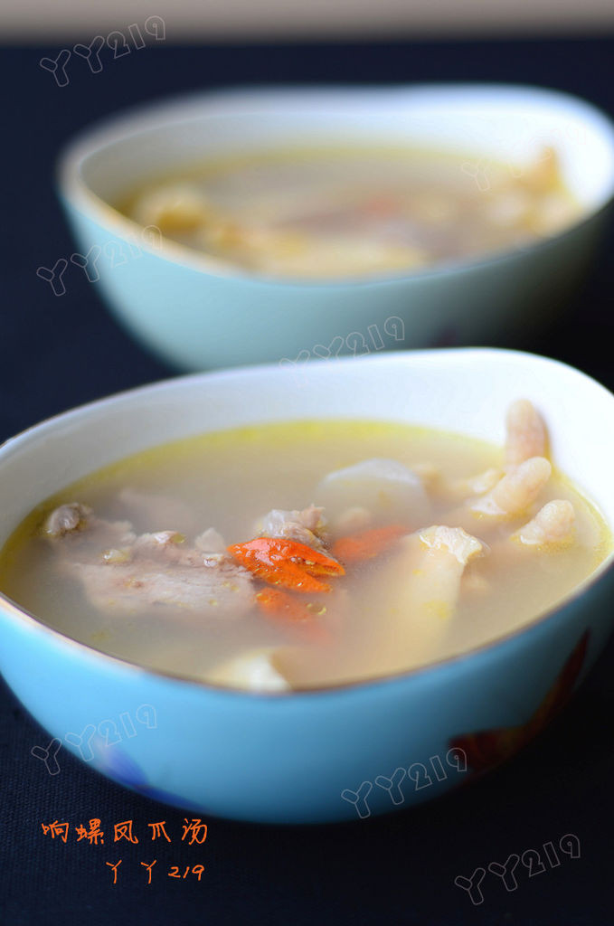 金秋十月,北方大多数地区已逐渐进入秋高气爽的好季节,可属于亚热带季风气候的深圳天气仍旧燥热,大鱼大肉的来进行进补,食欲肯定会大受影响,那我们就喝汤进补吧。【响螺凤爪汤】,用滋阴的响螺片,补脚力的鸡爪,补脾肺、固肠胃的淮山,清肝、明目的枸杞,一起炖再加上少许的猪肉提鲜,其汤香润可口,还有滋阴、强筋骨的功效。快炖上一锅,与家人一起品尝吧。
