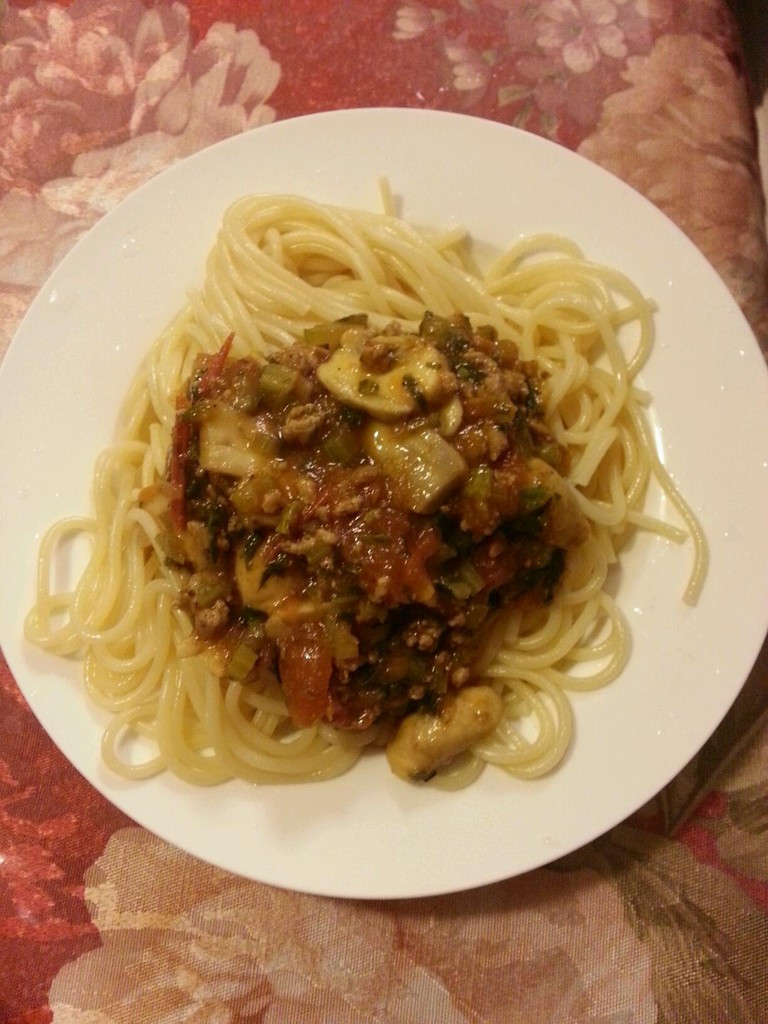 某天,我和嘟嘟他爸没饭吃,我趁爷俩睡觉到菜市场溜达,正好看见新鲜的口蘑,想起家里还有肉馅,立刻决定来盘意面,又买到新鲜翠绿的芹菜,回家开始热火朝天的准备,由于中间伺候小东西吃喝,这盘意面端上来已经9点了,当时觉得真好吃啊,明明是3个人的分量,被我俩吃了个七七八八,哈哈
