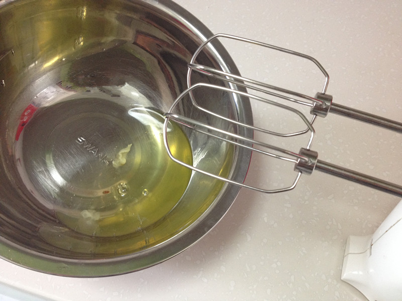 接下来就要开始打蛋白了,工具的话,我用的是电动的打蛋器,价格嘛百元左右,如果准备跳烘焙这个坑,这是必备的工具啦,省力省时间。 我用了2个蛋白,比较好打发一点,因为量少,所以我把盆倾斜了一点,这样让蛋白可以和打蛋器充分接触利于打发。