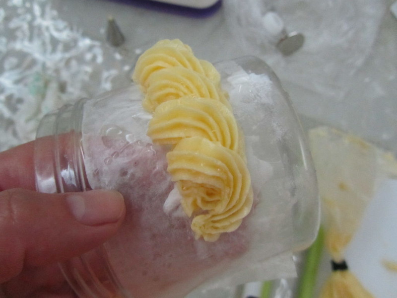 说实话,裱花蛋糕做的很少, 就想着从基础的开始试做起,这让我想到了花篮蛋糕,它是裱花最基础之一,也就是考验裱花者画直线是否直、挤出的糖霜是否均匀。还是选用的奶油糖霜,它定型好,适合我这新手。建议大家是:在给蛋糕裱花之前, 准备个干净的案板上, 多练习几下, 而且这样做奶油糖霜也不会浪费,可以重复使用;如果手心温度使得糖霜融化, 放入冰箱中冷藏五分钟一下再拿出来使用; 反复几次后, 这样就能画出非常直得直线来了。