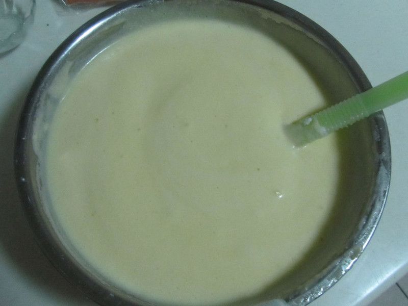 4. 将蛋黄乳酪糊和蛋白混合时, 要注意从底部轻轻挑起, 这样不会消泡;