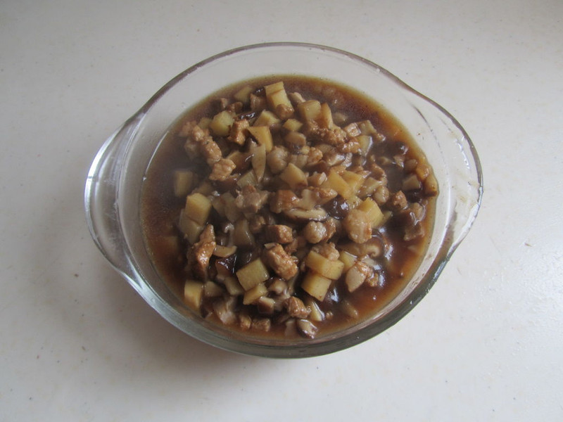 第二 馅料。 湖北烧梅的馅料是以肉丁、香菇、笋丁为主, 炒制好的馅料可以适量多留点汤汁,趁着糯米饭温热时混合, 再加以大量的黑胡椒粉(这是湖北烧梅的特色, 如果不适应, 可以相对减少它的使用量)和适量的盐调味搅拌均匀, 这样糯米饭能充分的吸收三鲜馅料的香味; 而加入小葱末时,则要等到搅拌好的馅料几乎凉后再放, 这样能完全保留葱香味。