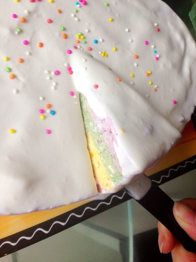 本来可以做个彩虹裱花,但我犯懒,没弄,而且奶油没打发到位,太稀了,将就看看吧