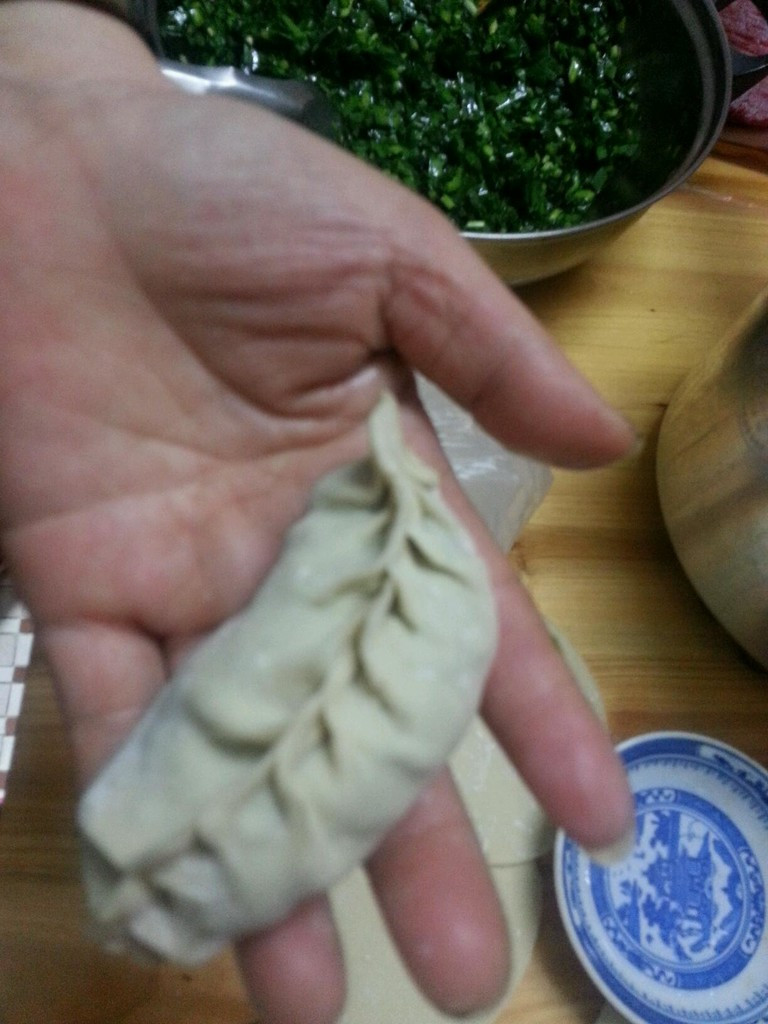 用汤勺把韭菜放在饺子皮上,注意要能包合上的量,量不能太多。要控制恰当,然后用刚才准备了一小碗凉水,用手轻轻沾上一点凉水抹在饺皮边