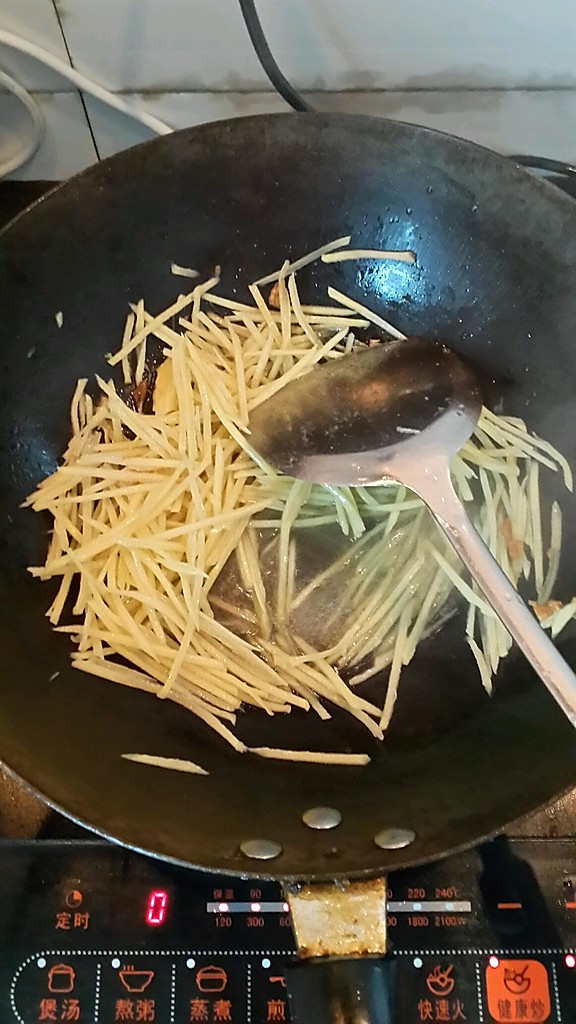 土豆丝一定炒粘稠后在添水.黄瓜丝在最后放入.因为黄瓜比较爱熟