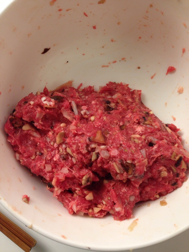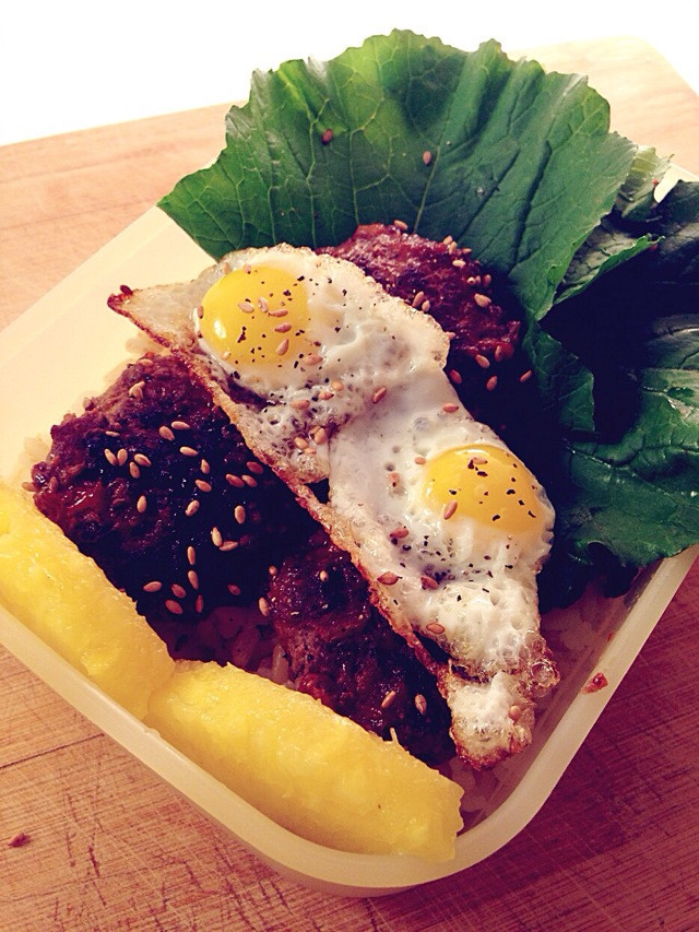 普通意义上的汉堡包是两片面包夹烤好的牛肉饼配蔬菜和酱料,这里把碳水化合物的来源从面包变成了米饭。汉堡肉饼尺寸缩小,酱料均匀裹在肉饼上。在汉堡肉饼的制作中,通常会加一种叫Worcestershire 的酱,不过我没有,就用鱼露番茄酱和白酒调汁代替这种酱汁。将煎蛋夹到汉堡里的做法我在古巴汉frita 里见到过,这里用鹌鹑蛋代替。蔬菜可以酌情增加。多吃蔬菜很健康。