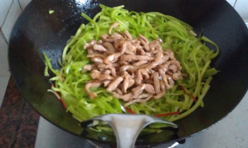 凉瓜因为切成了丝,所以在炒的时候,要先处理比较难熟的肉类再制作凉瓜,这样才能达到成熟度一致。