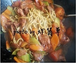 3.这道炒面关键的就是那一大勺甜面酱,加入甜面酱让炒面的汤汁浓稠,这样每根面条上都会吸附汤汁,加少许老抽给面条上色,让面条色泽更诱人。