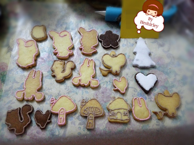 说起这个作品简直是泪流满面呀,一开始我是想简单的做几个自己喜欢的my melody其中几个模型的饼干,因为没有买到饼干模,所以只能自己先用纸打印了剪下来,然后又怕纸不卫生,所以后来又用胶片剪了模型。好不容易剪完了模型,以为后面能简单点,结果用模型去刻面的时候原来比剪的时候还要晕人,由于现在温度太高,面从冰箱拿出来弄不到一个就又变软了,弄的我快要晕掉,所以后来就改成了做糖霜饼干了。真是一波三折呀。