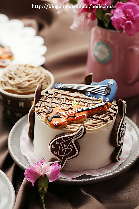 装饰上用的之前做的音乐风格的糖霜饼干,做了有一段时间了,最终决定与朗姆栗子蛋糕搭配,同样耐人寻味,其实音乐与美食本来就是心心相映的,两者都会令人们享受,让人为其沉醉。
