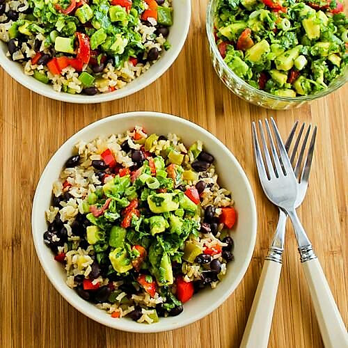 墨西哥素食沙拉 将一杯切碎的洋葱,2杯蔬菜汤和一杯长粒糙米混合后煮1小时30分钟。拌入2颗切碎的红、绿柿子椒,15盎司沥干水分的煮熟黑豆,4盎司葱末辣椒(连汁),和少许盐,煮30分钟以上直到米饭变软。煮饭的同时,将两个切成丁的鳄梨,2杯切碎的番茄,切碎的香菜,葱花末,2杯柠檬汁,橄榄油,小茴香和盐混合均匀,饭熟后浇上饭上面,轻轻拌匀成沙拉。