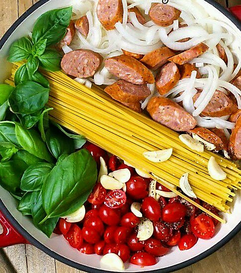 香肠芝士通心粉 将3杯切成两半的樱桃西红柿,1个切丁的大洋葱,1磅切成片状的意大利熏香肠,20片罗勒叶,4瓣切成末的大蒜,1茶匙粗盐,1茶匙新鲜胡椒粉,4杯水和10盎司意大利面条混合在一次,放入锅中大火煮7到9分钟。