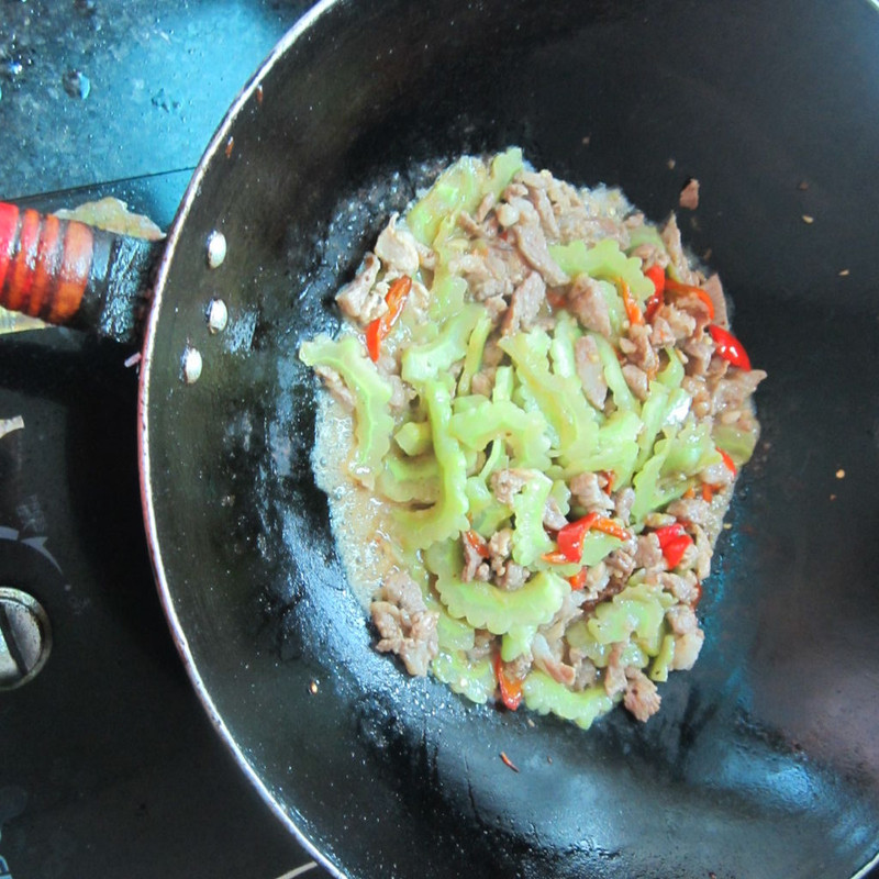 另一种方法炒好的肉和辣椒盛也再另起锅另烧渍炒苦瓜,肉不会太老。